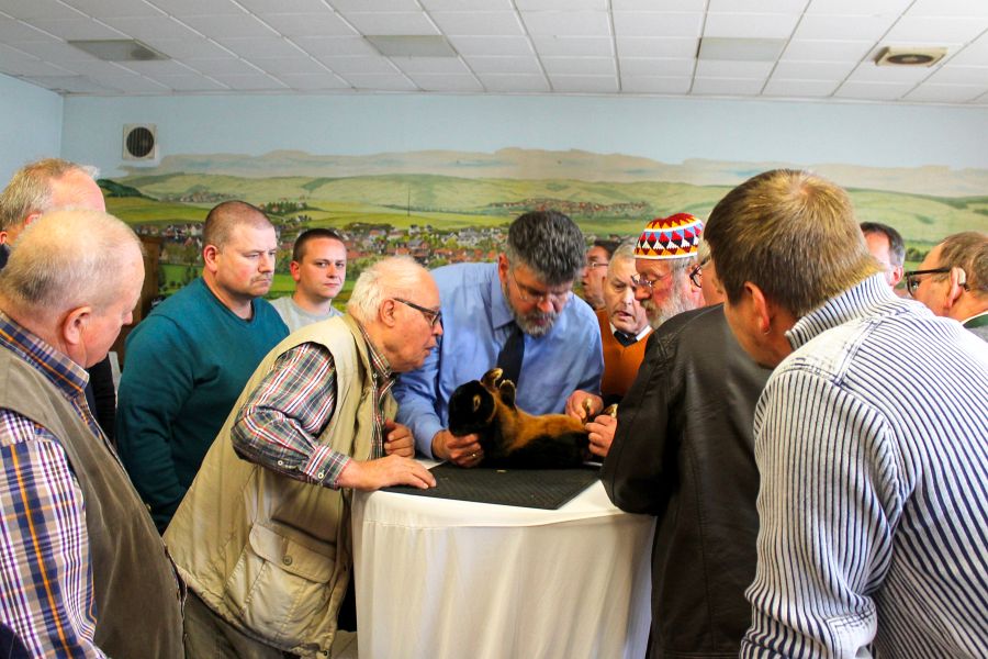 Am Nachmittag stand dann die praktische Arbeit an den mitgebrachten Tieren im Mittelpunkt. Eigentlich wollte man diese Tierbesprechungen nicht mehr durchführen, weil die Organisatoren im Vorfeld viel Arbeit haben und jedes Jahr weniger Tiere von den Delegierten vorgestellt wurden, aber "eine derartige Tagung kann nicht ohne Tiere leben!", so Dr. Thomas Schneider. Hier wurden dann insbesondere die Ohrenlängen intensiv diskutiert und mögliche Vorgaben für die Zucht erörtert. Es wurde zunächst von 9,5 bis 10 cm ausgegangen, weil dies eigentlich die ideale Ohrenlänge sei, aber man wollte sich auch nicht zu sehr einengen, um spätere Bestrafungen bei Bewertungen zu vermeiden, wenn es dann eventuell an 0,5 cm liegen sollte. Es wurde auch vereinzelt angemerkt, dass man kein Freund vom Ohrenmessen sei und keine konkrete Länge festgelegt werden sollte, denn die Ohren sollten zu den Proportionen des Tieres passen. Die Versammlung beschloss nach längerer Diskussion, dass der Versammlungsleiter der ZDRK-Standardkommission mitteilen solle, dass eine Ohrenlänge von 8,5 bis 10,5 cm für den neuen Standard die sinnvollste Lösung darstellen würde.